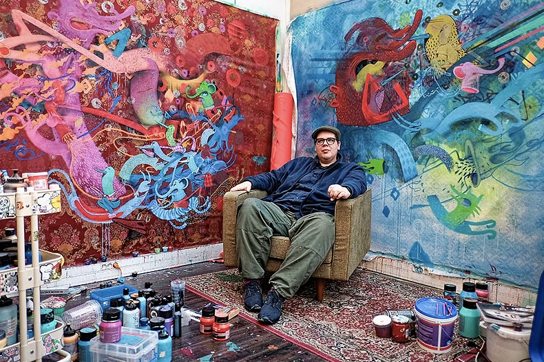 Artiste peintre issu du graffiti, Alëxone Dizac (Alexandre) développe depuis plus de vingt ans une œuvre immédiatement identifiable, portée par une énergie populaire, une malice constante et un goût prononcé pour le jeu: jeu de mots, d’images, de références. Ses tableaux s’élaborent à partir d’une base colorée souvent construite sur des fonds textiles aux motifs denses, comme un décor volontairement “bourgeois” que l’artiste vient détourner et contaminer.