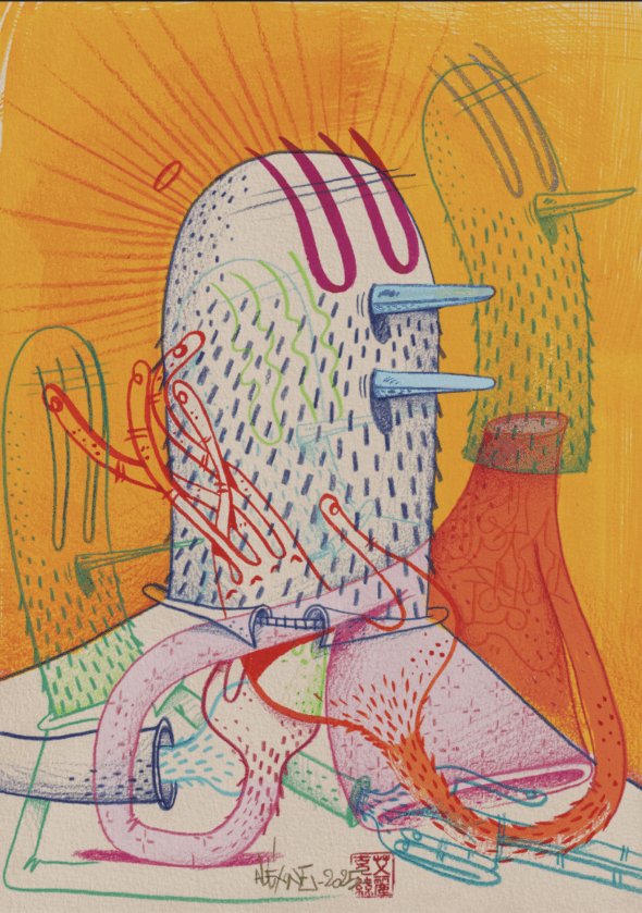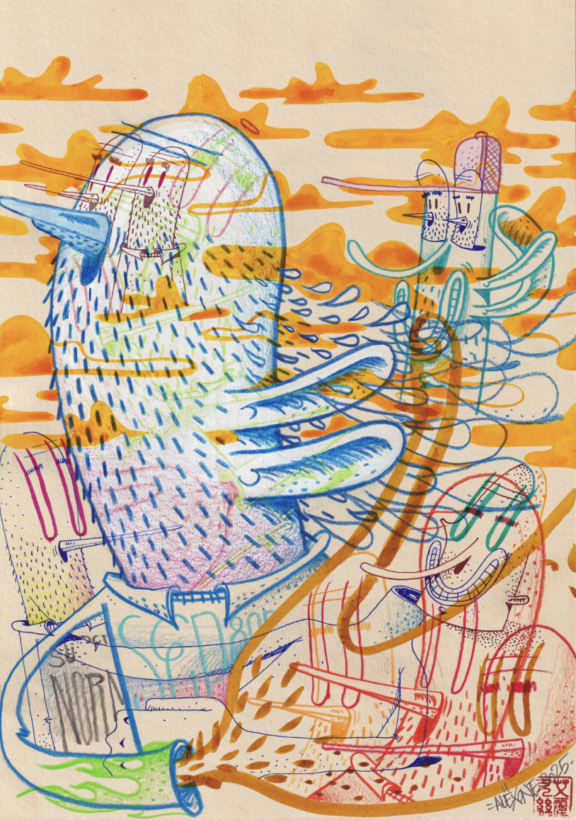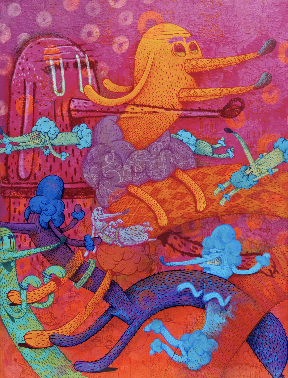 Dans cet espace surgissent des figures animales et humaines, chimères fantasques et drôles, issues d’un bestiaire personnel en perpétuelle expansion. Les pingouins anthropomorphes, devenus emblématiques, traversent son travail comme des protagonistes à part entière : tantôt sujets centraux, tantôt simples signes graphiques intégrés à la composition.